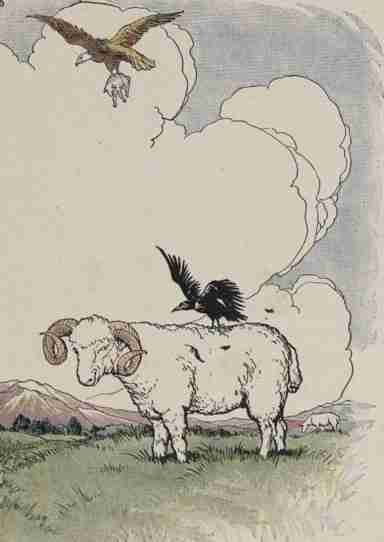 « backAn Eagle, swooping down on powerful wings, seized a lamb in her talons and made off with it to her nest. A Jackdaw saw the deed, and his silly head was filled with the idea that he was big and strong enough to do as the Eagle had done. So with much rustling of feathers and a fierce air, he came down swiftly on the back of a large Ram. But when he tried to rise again he found that he could not get away, for his claws were tangled in the wool. And so far was he from carrying away the Ram, that the Ram hardly noticed he was there.