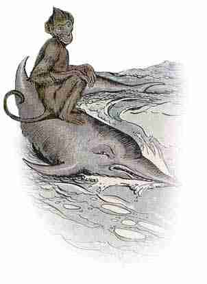 Now it was the custom among the Greeks to take their pet monkeys and dogs with them whenever they went on a voyage. So when one of the Dolphins saw a Monkey struggling in the water, he thought it was a man, and made the Monkey climb up on his back. Then off he swam with him toward the shore.