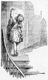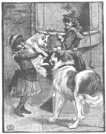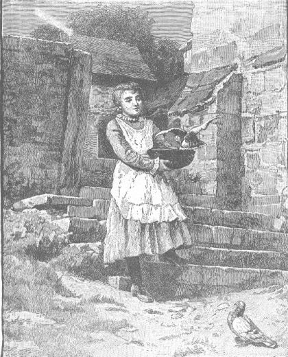 There is some one else who thinks them as pretty as I do, and I'll tell you all about her. It was last year, early in the autumn, that I went out with the pan into the front yard to feed them, and walked down the stone steps, calling the pigeons all the way, while they flew after me. I didn't notice anything in the road, which was just in front of me, until I saw a very big man in a grand livery picking his way across the yard, and then I noticed a carriage had stopped in front of the house, and the lady inside was looking at me and at my pigeons. She beckoned me to come to her; but I was too shy, and ran into the house, to find Mother, who went out to the lady, and I followed just behind her.