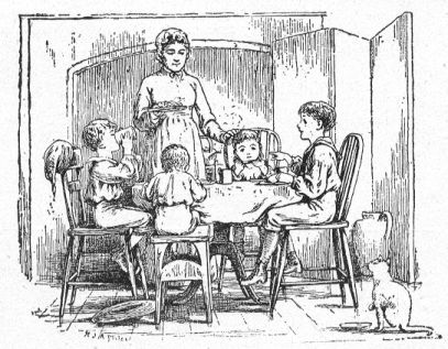 "I shall get all dried off before night," she exclaimed, as she hung out the snowy sheets, and the children's shirts and pinafores, which latter looked rather like doll's clothes as they hung on the line beside father's great stockings.