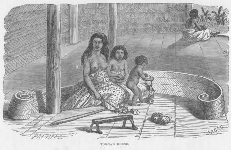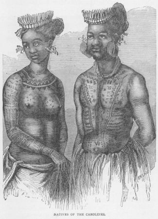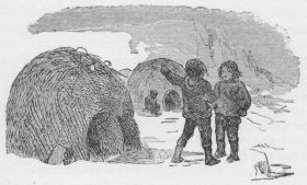 On these occasions the natives came and made friends with the voyagers, and subsequently these Tchuktches welcomed the foreigners. The description given of the natives and their dwellings is curious. They live in large tents, which enclose sleeping-places or a kind of inner chambers, heated and lighted by an oil lamp. In these inner rooms the native women sit, with very little clothing on. In summer a fire is kept burning in the centre of the hut, and the smoke goes up through a hole in the roof. In winter there is no fire, and presumably the hut is closed against the outer air. The Greenlanders and Tchuktches use similar household articles: they trade for needles, knives and tools, linen shirts, etcetera, and especially brandy. Everyone smokes tobacco when he or she can obtain it. When it cannot be had, some herbs are chewed and smoked, after being dried behind the ears. Men and women seldom wear head coverings; they have tunics and trousers of reindeer skin, mocassins or shoes of bear-skin or walrus hide; the women plait their hair, and wear it long. The men cut theirs except the outer margin, which is combed down in a “fringe.” The faces are painted or “tattooed” by both sexes.
