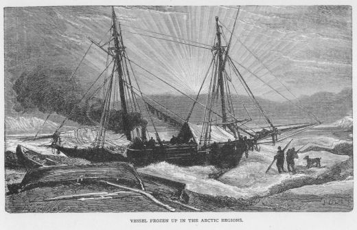 The gloom of Arctic night prevented any more exploration. The vessel continued to drift northward, and at length the floe was driven on an island, where it remained with the vessel, three miles from the shore. The second winter now began. In January the cold was very severe: the oil froze, the lamps went out, and the brandy even was congealed into a solid mass. Bears paid the voyagers frequent visits, and many were shot; but all males, no female bears appeared.