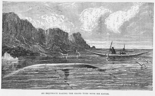 Time passed. October went and November came; food was scarce, and the exploring party were “allowanced.” But two seals, less cautious than their companions, were at length captured—nearly all the dogs had already been eaten, and fresh food was absolutely necessary. The seals caught were scientifically killed, the blood was drunk, and “the eyes,” says Captain Tyson, “given to the youngest child.” (The animal, being cut up, is divided into portions which are distributed by lot to the various candidates for the delicate morsels, of which the brain is considered the daintiest.)