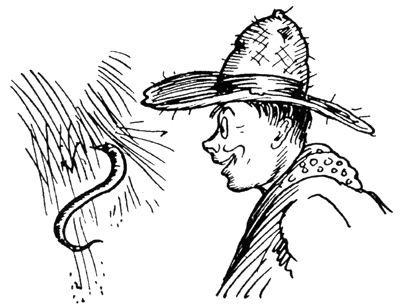 When he had finished his work he picked Unc' Billy up by the tail once more, opened the door, and started for the house with Unc' Billy swinging from112 his hand and bumping against his legs. Still Unc' Billy gave no sign of life. He wondered where he was being taken to. He was terribly frightened. But he stuck to his old trick of playing dead which had served him so well more than once before.