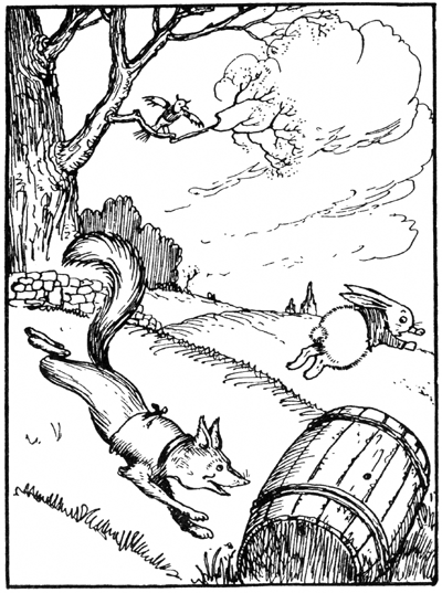 Peter Rabbit's jump over the old barrel on the edge of the hill was unexpected to Reddy Fox. In fact, Reddy was so close on Peter's heels that he had no thought of anything but catching Peter. He was running so fast that when Peter made his flying jump over the barrel, Reddy did not have time to jump too, and he ran right smack bang against that old barrel. Now you remember that that barrel was right on the edge of the hill. When Reddy ran against it, he hit it so hard that he rolled it over, and of course that started it down the hill. You know a barrel is a very rolly sort of thing, and13 once it has started down a hill, nothing can stop it.