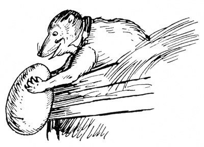 Jimmy Skunk hurried after Unc' Billy. It wasn't fear that caused Jimmy to hurry. No, indeed, it wasn't fear. He had been startled by the unexpectedness of Bowser's appearance. It was this that had caused him to struggle to be first through that hole under the henhouse. But once through, he had felt a bit ashamed that he had been so undignified. He wasn't afraid of Bowser. He was sorely tempted to turn around and send Bowser about his business,87 as he knew he very well could. But he thought better of it. Besides, Unc' Billy was already through that hole in the floor, and Jimmy didn't for a minute forget what had brought him there. He had come for eggs, and so had Unc' Billy. It would never do to let Unc' Billy be alone up there for long. So Jimmy Skunk did what he very seldom does—hurried. Yes, Sir, he hurried after Unc' Billy Possum. He meant to make sure of his share of the eggs he was certain were up there.