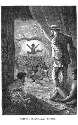 Chimbolo, with his recovered wife and child, sought safety from the slavers in the far interior, and continued to think with pleasure and gratitude of the two Englishmen who hated slavery, and who had gone to Africa just in the nick of time to rescue that unhappy slave who had been almost flogged to death, and was on the point of being drowned in the Zambesi in a sack. Mokompa, also, continued to poetise, as in days gone by, having made a safe retreat with Chimbolo, and, among other things, enshrined all the deeds of the two white men in native verse. Yambo continued to extol play, admire, and propagate the life-sized jumping-jack to such an extent that, unless his career has been cut short by the slavers, we fully expect to find that creature a “domestic institution” when the slave-trade has been crushed, and Africa opened up—as in the end it is certain to be.