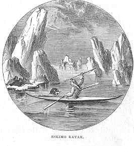 The canoes used by the Eskimos who inhabit the Polar Regions are made of a light framework of wood, which is covered entirely over with seal-skin—a round hole being left in the centre, in which the Eskimo sits. Round this hole there is a loose piece of skin, which is drawn up by the man and fastened round his waist. The machine is thus completely water-tight. No waves can dash into, although they can sweep over it; and if by chance it should upset, the Eskimo can turn it and himself up into the proper position by one dexterous sweep of his long, double-bladed paddle. The paddle, which varies from ten to fifteen feet, is simply a pole with a blade at each end. It is grasped in the centre, and each end dipped alternately on either side of the kayak, as this canoe is called. Eskimo kayaks are first-rate sea-boats. They can face almost any sort of weather. They are extremely light, and are propelled by the natives very swiftly. In these frail canoes the natives of the Polar Regions pursue seals and whales, and even venture to attack the walrus in his native element. The kayak is used exclusively by the men. The oomiak, or women’s canoe, is of much larger and clumsier construction, somewhat like a boat. It is open above, and can hold a large family of women and children. Like the kayak, it is a framework of wood covered with seal-skin, and is propelled by means of short paddles of the spoon form.