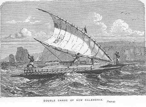 One of these double canoes is thus described by Cheever in his “Island World of the Pacific:”—“A double canoe is composed of two single ones of the same size placed parallel to each other, three or four feet apart, and secured in their places by four or five pieces of wood, curved just in the shape of a bit-stock. These are lashed to both canoes with the strongest cinet, made of cocoa-nut fibre, so as to make the two almost as much one as same of the double ferry-boats that ply between Brooklyn and New York. A flattened arch is thus made by the bow-like cross-pieces over the space between the canoes, upon which a board or a couple of stout poles laid lengthwise constitute an elevated platform for passengers and freight, while those who paddle and steer sit in the bodies of the canoes at the sides. A slender mast, which may be unstepped in a minute, rises from about the centre of this platform, to give support to a very simple sail, now universally made of white cotton cloth, but formerly of mats.”