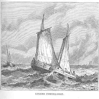 Off the coast of Portugal we meet with many different kinds of craft, of which the trading schooners differ from almost any other kind of vessel. Broad in the beam, and short in the counter, some are rounded at the stem, some nearly square. They are decked, and are from forty to one hundred tons burden. They are peculiarly rigged, having only lower masts stepped at different angles. The gaffs of the fore-sail, as well as the main-sail, can be raised to different heights. They have fore stay-sail, jib and flying jib, gaff top-sails, and a large square sail and square top-sails. On the whole, they are ungainly-looking craft in the extreme; but they are very capable sea-boats, and make voyages as far as South America.
