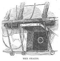 Some idea of the magnitude and weight of the vessel may be formed from the fact that each iron plate weighs about the third of a ton, and is fastened with a hundred iron rivets. About thirty thousand of these plates were used in her construction, and three million rivets. The fastening of these rivets was one among the many curious operations performed in course of building. The riveting men were arranged in gangs, each gang consisting of two riveters, one holder-up, and three boys. Two boys were stationed at the fire or portable forge, and one with the holder-up. This boy’s duty was to receive the red-hot rivet with his pincers from the boy at the forge, and insert it in the hole destined for its reception, the point protruding about an inch. The holder-up immediately placed his heavy hammer against the head of the rivet, and held it firmly there, while the two riveters assailed it in front with alternate blows, until the countersunk part of the hole was filled up, after which the protruding head was cut off smooth with the plate, the whole operation scarce occupying a minute. In riveting the double part of the ship the holder-up and his boy were necessarily in the interior part of the tubes, and passed the whole day in the narrow space between, (of two feet ten inches wide), in comparative darkness, having only the glimmer afforded by a single dip candle, and being immediately under the deafening blows of the riveters.