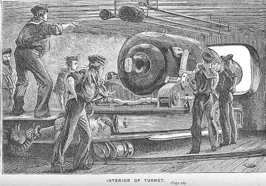 There is no keel properly so called, but in its place a flat keel-plate of iron, about two feet wide and one inch thick, which runs the entire length from stem to stern. This is the base upon which all the rest is reared, plates and girders alike. The iron plates which form her planking are three-quarters of an inch thick. Up to the water-mark the hull is constructed with an inner and outer skin, two feet ten inches apart, both skins being made of three-quarter inch plates, except at the bottom, where the plates are an inch thick; and between these, at intervals of six feet, run horizontal webs of iron plates, which bind the two skins together, and thus it may be said that the lower part of the hull is two feet ten inches thick.