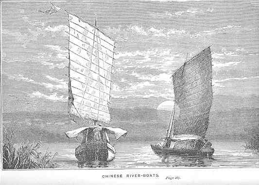 Chinese junks vary greatly in size, but all present the same type of architecture. The sails in every case are of brownish-yellow matting, swung across the mast like a main-sail, and having pieces of bamboo placed cross-wise and parallel to each other, making them look somewhat like venetian blinds. These wooden strips both strengthen the sail and facilitate its reefing when lowered.