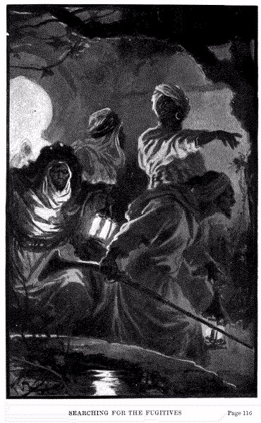 A few minutes later and, as the Moor had prophesied, pistol-shots were heard on shore. From the sound they appeared to come from a short distance in the interior of the land, but musket-shots were also heard among them, and from the flashes on the beach it became evident that the Moor had not succeeded in turning all their pursuers off the scent—a fact which was further illustrated by the skipping of a musket ball close past the boat.