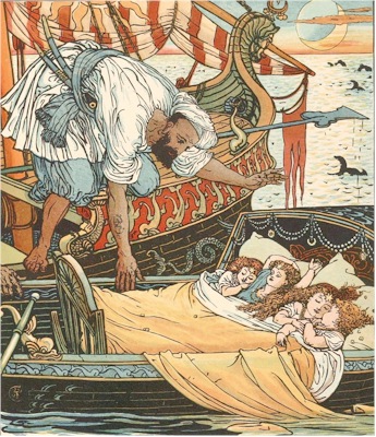 So she had a boat brought round to the beach, and put the four babes, with some strings of jewels, into a cradle, which she placed in the boat, and then set it adrift. The boat was soon far out at sea. The waves rose, the rain poured in torrents, and the thunder roared. Feintise could not doubt that the boat would be swamped, and felt relieved by the thought that the poor little innocents would perish, for she would otherwise always be haunted by the fear that something would occur to betray the share she had had in their preservation.