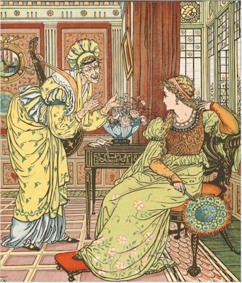Once upon a time there were three Princesses, named Roussette, Brunette, and Blondine, who lived in retirement with their mother, a Princess who had lost all her former grandeur. One day an old woman called and asked for a dinner, as this Princess was an excellent cook. After the meal was over, the old woman, who was a fairy, promised that their kindness should be rewarded, and immediately disappeared.