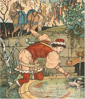 At this terrible scene he descended, and more than once gave himself up for lost. As he approached this great fire he was ready to die with thirst; and perceiving a spring falling into a marble basin, he alighted from his horse, approached it, and stooped to take up some water in the little golden vase which he had brought with him, when he saw a turtle-dove drowning in the fountain. Cheri took pity on it, and saved it. "My Lord Cheri," she said, "I am not ungrateful; I can guide you to the dancing-water, which, without me, you could never obtain, as it rises in the middle of the forest, and can only be reached by going underground." The Dove then flew away, and summoned a number of foxes, badgers, moles, snails, ants, and all sorts of creatures that burrow in the earth. Cheri got off his horse at the entrance of the subterranean passage they made for him, and groped his way after the kind Dove, which safely conducted him to the fountain. The Prince filled his golden vase; and returned the same way he came.