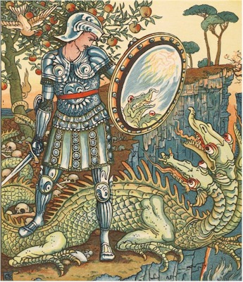 Prince Cheri at break of day perceived a handsome young man, from whom he learned where the singing-apple was to be found: but after travelling some time without seeing any sign of it, he saw a poor turtle-dove fall at his feet almost dead. He took pity on it, and restored it, when it said, "Good-day, handsome Cheri, you are destined to save my life, and I to do you signal service. You are come to seek for the singing-apple: it is guarded by a terrible dragon." The Dove then led him to a place where he found a suit of armour, all of glass: and by her advice he put it on, and boldly went to meet the dragon. The two-headed monster came bounding along, fire issuing from his throat; but when he saw his alarming figure multiplied in the Prince's mirrors he was frightened in his turn. He stopped, and looking fiercely at the Prince, apparently laden with dragons, he took flight and threw himself into a deep chasm. The Prince then found the tree, which was surrounded with human bones, and breaking off an apple, prepared to return to the Princess. She had never slept during his absence, and ran to meet him eagerly.