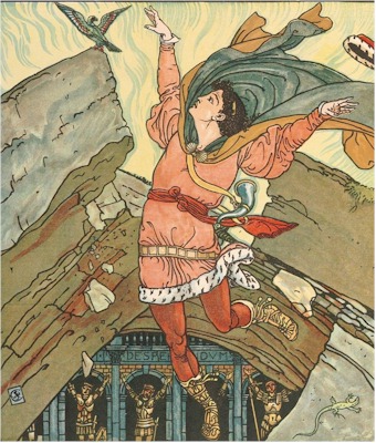 "Under my left wing there is a red feather," said the bird: "pull it out, and touch the rock with it."
