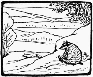 He sat in the sun, and conversed cordially with Tommy Brock, who was passing through the wood with a sack and a little spud which he used for digging, and some mole traps. He complained bitterly about the[Pg 14][Pg 13][Pg 12] scarcity of pheasants' eggs, and accused Mr. Tod of poaching them. And the otters had cleared off all the frogs while he was asleep in winter—"I have not had a good square meal for a fortnight, I am living on pig-nuts. I shall have to turn vegetarian and eat my own tail!" said Tommy Brock.