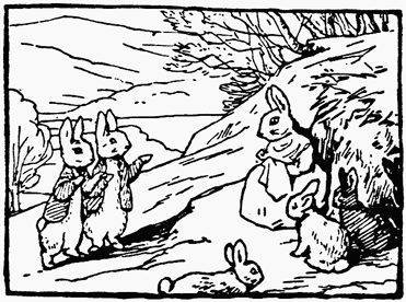 Great was old Mr. Bouncer's relief and Flopsy's joy when Peter and Benjamin arrived in triumph with the young family. The rabbit-babies were rather tumbled and very hungry; they were fed and put to bed. They soon recovered.