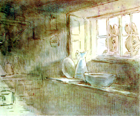 The setting sun made the window panes glow like red flame; but the kitchen fire was not alight. It was neatly laid with dry sticks, as the rabbits could see, when they peeped through the window.