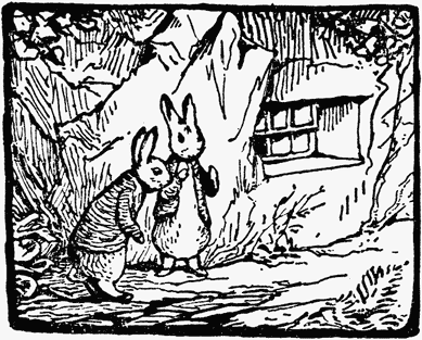 As soon as the coast was clear, Peter Rabbit and Benjamin Bunny came out of the bushes—