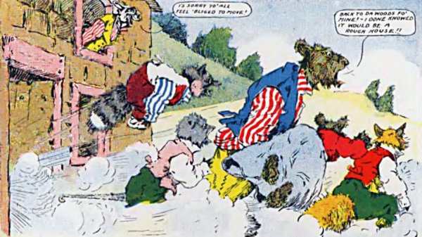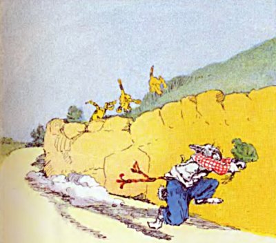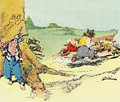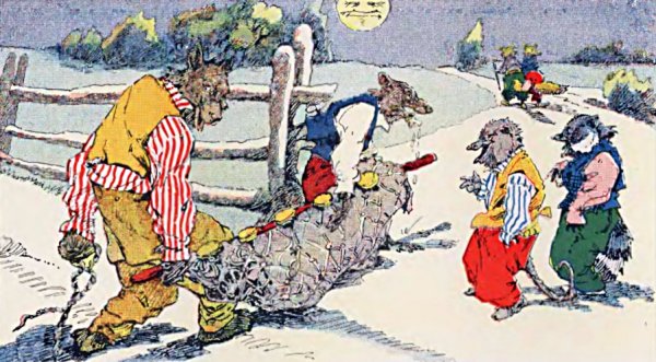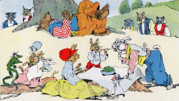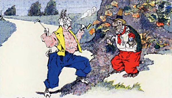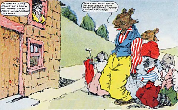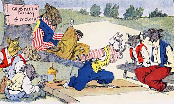 “Brer Wolf ain’t say nothin’, but make out he’s grabblin’, an’ den, all of a sudden, he made a dash at Brer Rabbit, but when he git whar Brer Rabbit wuz at, Brer Rabbit ain’t dar no mo’; he done gone. Weak an’ hongry ez he is, Brer Wolf know dat he can’t ketch Brer Rabbit, an’ so he holler out, ‘hat’s yo’ hurry, Brer Rabbit? Whar you gwine?’ Brer Rabbit holler back, ‘I’m gwine home atter a bag fer ter tote de gol’ you gwine leave me! So long, Brer Wolf; I wish you mighty well!’ an’ wid dat he put out fer home.”