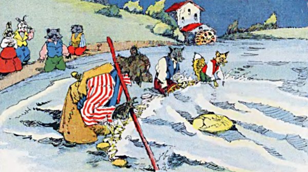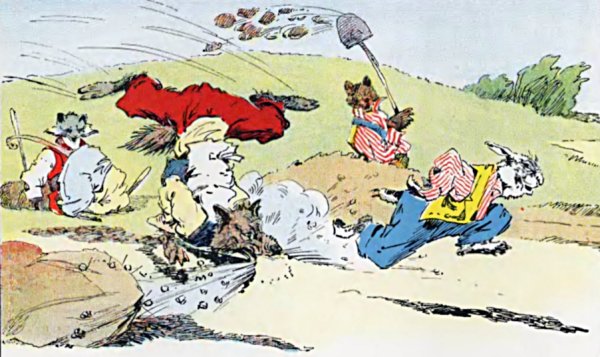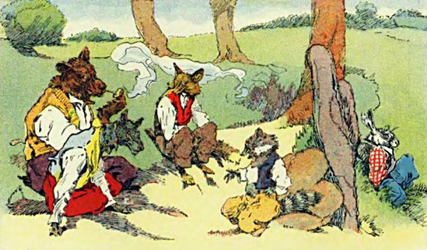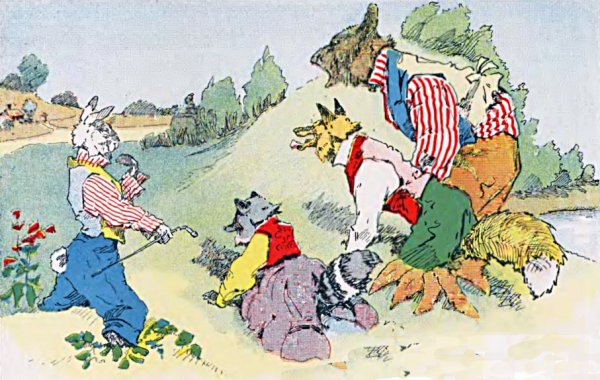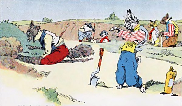 “Well, dis went on fer de longest, but bimeby, one day, dey all ’gree dat sump’n bleeze ter be done, an’ dey say dey’ll all take one big hunt fer de gol’ mine, an’ den quit. Dey hunted in gangs, wid de gangs not fur fum one an’er, an’ it so happen dat Brer Rabbit wuz in de gang wid Brer Wolf, an’ he know’d dat he hatter keep his eyes wide open. All de creeturs hatter dig in diffunt places, an’ whiles Brer Rabbit want much uv a grabbler, he had a way er makin’ de yuthers b’lieve dat he wuz de best er de lot. So he made a heap er motion like he wuz t’arin’ up de yeth. Dey ain’t been gwine on dis away long fo’ Brer Wolf holler out,