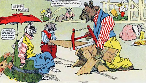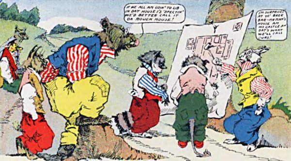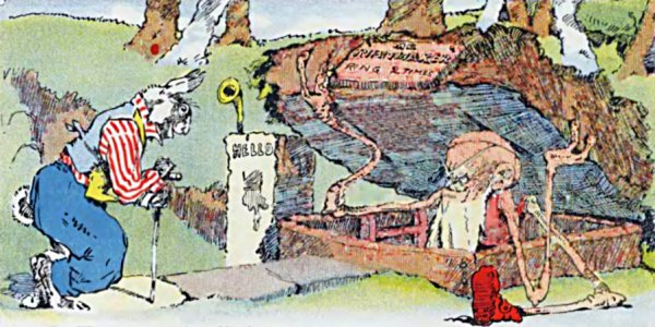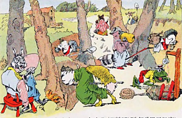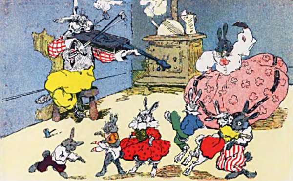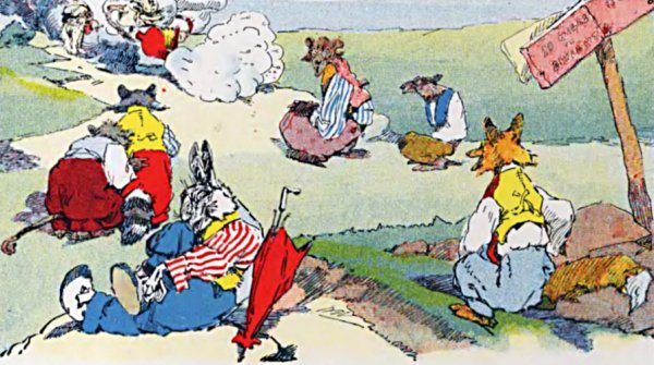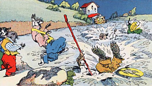 “De creeturs had der meetin’-place, whar dey could all set ’roun’ an’ talk de kind er politics dey had, des like folks does at de cross-roads grocery. One day, whiles dey wuz all settin’ an’ squottin’ ’roun’, jowerin’ an’ confabbin’, Brer Rabbit, he up ’n’ say, sezee, dat ol’ Mammy-Bammy-Big-Money tol’ his great gran’daddy dat dar wuz a mighty big an’ fat gol’ mine in deze parts, an’ he say dat he wouldn’t be ’tall ’stonished ef ’twant some’rs close ter Brer B’ar’s house. Brer B’ar, he growled, he did, an’ say dat de gol’ mine better not let him fin’ it, kaze atter he got done wid it, dey won’t be no gol’ mine dar.