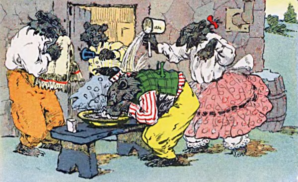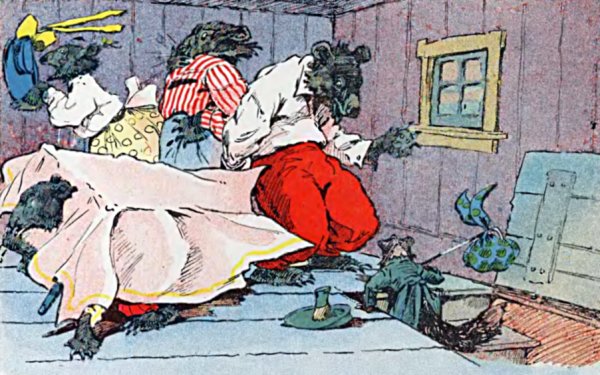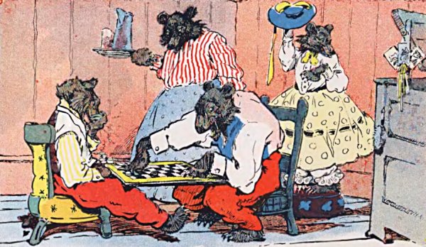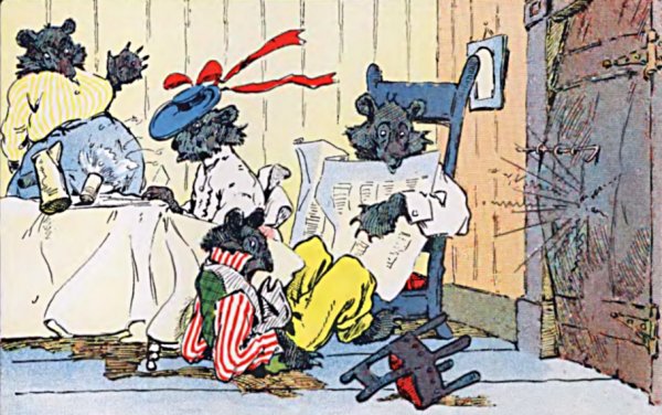 “Well, time went on an’ fotched de changes dat might be spected, an’ one day dar come a mighty knockin’ on Brer B’ar’s do’. Brer B’ar, he holla out, he did. ‘Who dat come a-knockin’ dis time er de year, ’fo’ de corn’s done planted, er de cotton-crap’s pitched?’ De one at de do’ make a big noise, an’ rattle de hinges. Brer B’ar holla out, he did, ‘Don’t t’ar down my house! Who is you, anyhow, an’ what you want?’ An’ de answer come, ‘I’m one an’ darfo’ not two; ef youer mo’ dan one, who is you an’ what you doin’ in dar?’ Brer B’ar, he say, sezee, ‘I’m all er one an’ mighty nigh two, but I’d thank you fer ter tell me yo’ full fambly name.’ Den de answer come.