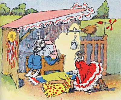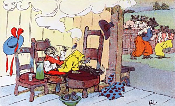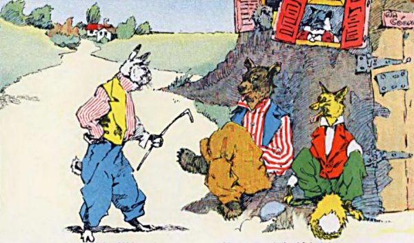 “So fur, so good! But all de time dey wuz jowerin’ an’ confabbin’, ol’ Brer Rabbit wus settin’ in a shady place in de grass, a-hearin’ eve’y word dey say. When de time come, he crope out, he did, an’ run ’roun’, an’ de fust news dey know’d, here he come down de big road—bookity-bookity—same ez a hoss dat’s broke thoo de pastur’ fence. He say, sezee, ‘Why, hello, frien’s! an’ howdy, too, kaze I aint seed you-all sence de last time! Whar de name er goodness is you been deze odd-come-shorts? an’ how did you far’ at de bobbycue? Ef my two eyeballs aint gone an’ got crooked, dar’s ol’ Brer B’ar, him er de short tail an’ sharp tush—de ve’y one I’m a-huntin’ fer! An’ dar’s Brer Coon! I sho is in big luck. Dar’s gwineter be a big frolic at Miss Meadows’, an’ her an’ de gals want Brer B’ar fer ter show um de roas’n’-y’ar shuffle; an’ dey put Brer Coon down fer de jig dey calls rack-back-Davy.