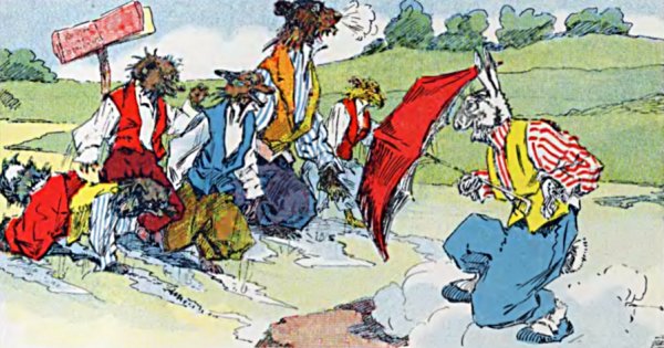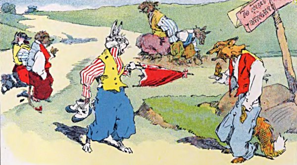 “It make um so mad, dat dey all put out atter ’im, an’ try der level best fer ter ketch, but ef dey wuz anything in de roun’ worl’ dat Brer Rabbit’s got, it’s soople foots, an’ ’twant no time ’fo’ de yuther creeturs can’t see ha’r ner hide un ’im! All de same Brer Rabbit aint bargain fer ter have two races de same day.”
