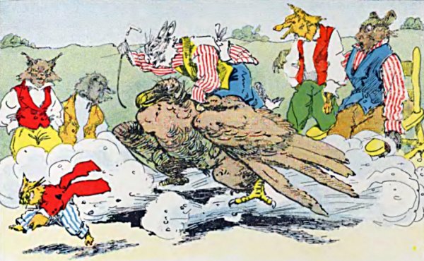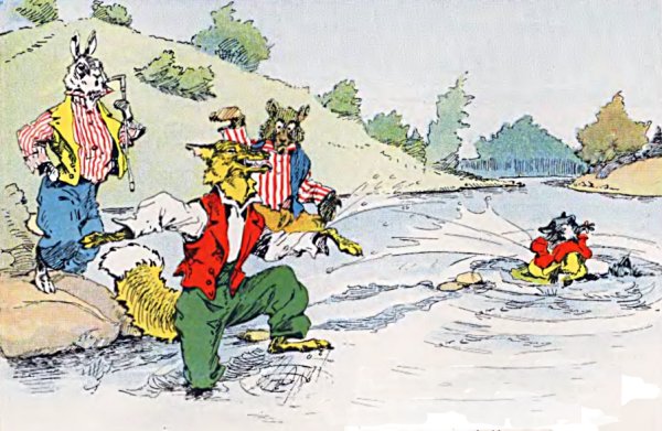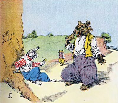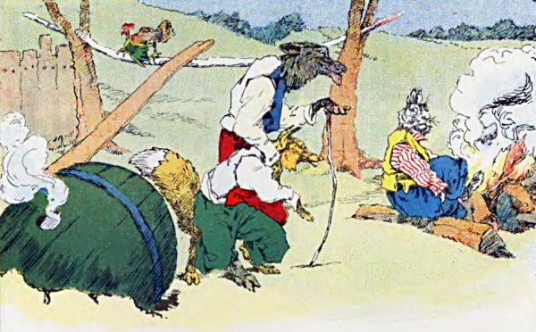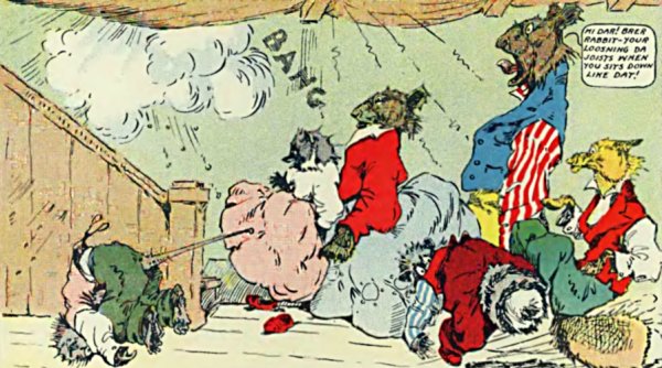 The little boy, when he next saw Uncle Remus, after hearing how the animals went to the barbecue, wanted to know what happened to them: he was anxious to learn if any of them were hurt by the dogs that had been chasing Brother Rabbit. The old darkey closed his eyes and chuckled. “You sho is axin’ sump’n now, honey. Und’ his hat, ef he had any, Brer Rabbit had a mighty quick thinkin’ apple-ratus, an’ mos’ inginner’lly, all de time, de pranks he played on de yuther creeturs pestered um bofe ways a-comin’ an’ a-gwine. De dogs done mighty well, ’long ez dey had dealin’s wid de small fry, like Brer Fox, an’ Brer Coon, an’ Brer Wolf, but when dey run ag’in’ ol’ Brer B’ar, dey sho struck a snag. De mos’ servigrous wuz de identual one dat got de wust hurted. He got too close ter Brer B’ar, an’ when he look at hisse’f in runnin’ water, he tuck notice dat he wuz split wide open fum flank ter dewlap.