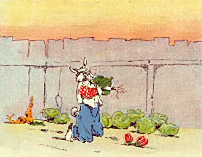 “Well, one mornin’, Mr. Man went out in his truck patch, an’ he fin’ sump’n missin’—a cabbage here, a turnip dar, an’ a mess er beans yander, an’ he ax how come dis? He look ’roun’, he did, an’ he seed Brer Rabbit’s tracks what he couldn’t take wid ’im. Brer Rabbit had lef’ his shoes at home, an’ come bar’footed.