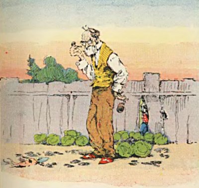 “Now, den, you done hear what I say. Dar wuz Mr. Man, yander wuz de gyarden, an’ here wuz ol’ Brer Rabbit.” Uncle Remus made a map of this part of the story by marking in the sand with his walking-cane. “Well, dis bein’ de case, what you speck gwineter happen? Nothin’ in de roun’ worl’ but what been happenin’ sence greens an’ sparrer-grass wuz planted in de groun’. Dey look fine an’ dey tas’e fine, an’ long to’rds de shank er de mornin’, Brer Rabbit ’ud creep thoo de crack er de fence an’ nibble at um. He’d take de greens, but leave his tracks, mo’ speshually right atter a rain. Takin’ an’ leavin’—it’s de way er de worl’.