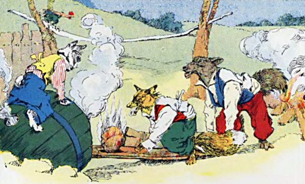 “Brer Fox roll his little eyes, an’ lick his chops whar he dribble at de mouf, an put out ter de bobbycue, an’ he aint mo’ dan made his disappearance, ’fo’ here come Brer Wolf, an’ when he got de news, off he put.