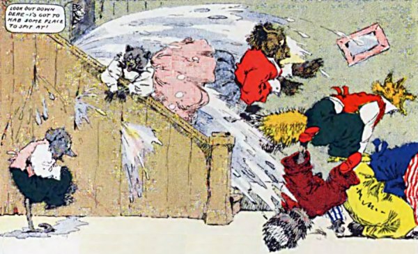 “An’ den, gentermens! de race begun fer ter commence. Uncle Win’ hep’d um bofe; he had his bellows wid ’im, an’ he blow’d it! Brer Dust got up fum whar he wuz a-layin’ at, an’ come down de road des a-whirlin’. He stricken ol’ Brer B’ar fust, den Brer Wolf, an’ den Brer Fox, an’ atter dat, all de yuther creeturs, an’ it come mighty nigh smifflicatin’ um! Not never in all yo’ born days is you y’ever heern sech coughin’ an’ sneezin’, sech snortin’ an’ wheezin’! An’ dey all look like dey wuz painted red. Brer B’ar sneeze so hard dat he hatter lay down in de road, an’ Brer Dust come mighty nigh buryin’ ’im, an’ ’twuz de same wid de yuther creeturs—dey got der y’ears, der noses, an’ der eyeses full.