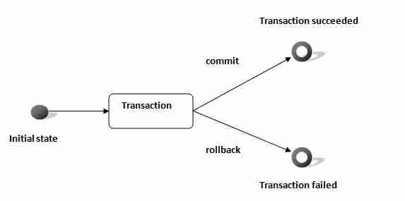 In the picture below we see there are 2 paths possible, if a transaction or a block of operation succeeds, then data change is commited to database, else database see no effect.