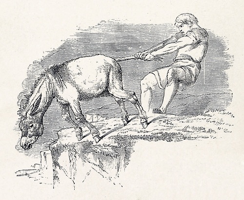 « backAn Ass was being driven along a road leading down the mountain side, when he suddenly took it into his silly head to choose his own path. He could see his stall at the foot of the mountain, and to him the quickest way down seemed to be over the edge of the nearest cliff. Just as he was about to leap over, his master caught him by the tail and tried to pull him back, but the stubborn Ass would not yield and pulled with all his might.