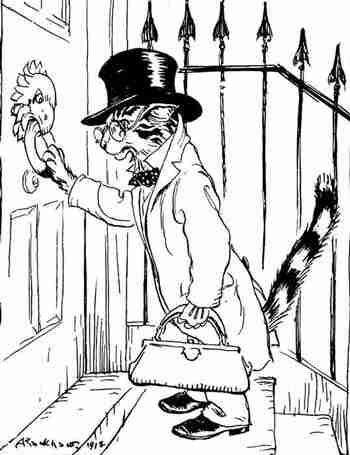 « backA Cat was growing very thin. As you have guessed, he did not get enough to eat. One day he heard that some Birds in the neighborhood were ailing and needed a doctor. So he put on a pair of spectacles, and with a leather box in his hand, knocked at the door of the Bird's home.