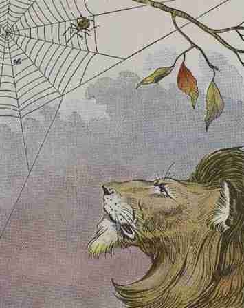 The Gnat buzzed away to tell the whole world about his victory, but instead he flew straight into a spider's web. And there, he who had defeated the King of beasts came to a miserable end, the prey of a little spider.