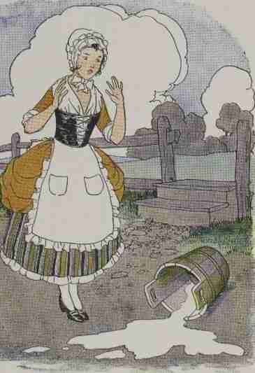 As she thought of how she would settle that matter, she tossed her head scornfully, and down fell the pail of milk to the ground. And all the milk flowed out, and with it vanished butter and eggs and chicks and new dress and all the milkmaid's pride.