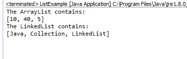 import java.util.ArrayList; import java.util.LinkedList; import java.util.List; public class ListExample { public static void main(String[] args) { List l1 = newArrayList(); l1.add(10); l1.add(40); l1.add(5); System.out.println("The ArrayList contains:"); System.out.print(l1); List s1 = newLinkedList(); s1.add("Java"); s1.add("Collection"); s1.add("LinkedList"); System.out.println("\n" + "TheLinkedList contains:"); System.out.print(s1); } }
