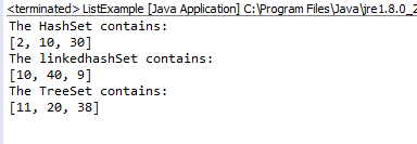 import java.util.HashSet; import java.util.LinkedHashSet; import java.util.Set; public class SetExample { public static void main(String[] args) {@SuppressWarnings("rawtypes") Set s1 = new HashSet(); s1.add(10); s1.add(30); s1.add(2); System.out.println("The HashSet contains:"); System.out.println(s1); Set h1 = new LinkedHashSet(); h1.add(10); h1.add(40); h1.add(9); System.out.println("The linkedhashSet contains:"); System.out.println(h1); Set t1 = new TreeSet(); t1.add(20); t1.add(11); t1.add(38); System.out.println("The TreeSet contains:"); System.out.println(t1); } }