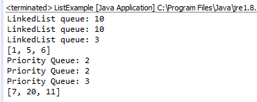 importjava.util.LinkedList; importjava.util.PriorityQueue; importjava.util.Queue; public class QueueExample { publicstaticvoid main(String args[]) { Queue q = newLinkedList(); q.add(10); q.add(1); q.add(5); q.add(6); System.out.println("LinkedList queue: "+q.peek()); //returns head element System.out.println("LinkedList queue: "+q.poll()); //removes head element and returns the removed element System.out.println("LinkedList queue: "+q.size()); //returns size of queue System.out.println(q); Queue pq = new PriorityQueue(); pq.add(20); pq.add(11); pq.add(7); pq.add(2); System.out.println("Priority Queue: "+pq.peek()); System.out.println("Priority Queue: "+pq.poll()); System.out.println("Priority Queue: "+pq.size()); System.out.println(pq); } }