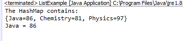import java.util.HashMap; public class MapExample { public static void main(String args[]) { HashMap m = new HashMap(); m.put("Physics", 97); //to add value m.put("Java", 86); //to add value m.put("Chemistry", 81); //to add value System.out.println("The HashMap contains: "); System.out.println(m); System.out.println("Java = " + m.get("Java")); //to get value at a particular key } }