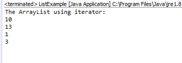import java.util.ArrayList; import java.util.Iterator; public class IteratorExample { public static void main(String args[]) { ArrayList a = new ArrayList(); a.add(10); a.add(13); a.add(1); a.add(3); Iterator i = a.iterator(); System.out.println("The ArrayListusing iterator: "); while (i.hasNext()) { System.out.println(i.next()); } } }
