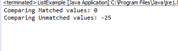 public class CompareExample { public static void main(String args[]) { String str1 = "Java"; String str2 = "Java"; String str3 = "compare"; System.out.println("Comparing Matched values: " + str1.compareTo(str2)); System.out.println("Comparing Unmatched values: " + str1.compareTo(str3)); } }