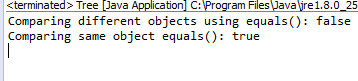 public class Tree { int height; Tree(int height) { this.height = height; } public static void main(String[] args) { Tree t1 = new Tree(21); Tree t2 = new Tree(8); System.out.println("Comparing different objects using equals(): " + t1.equals(t2)); //equals() compares instance not the values hence returns false System.out.println("Comparing same object equals(): " + t1.equals(t1)); // comparing same object hence return true. } }